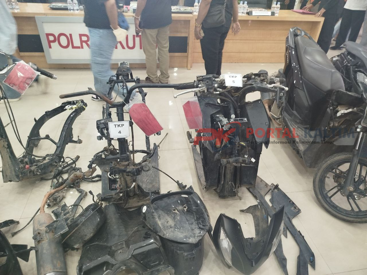 Komponen motor hasil curian seperti rangka, blok mesin, dan suku cadang dikumpulkan dalam karung, sementara beberapa suku cadang dipakai atau dibuang. Beruntungnya, nomor rangka masih utuh sehingga identifikasi tetap dimungkinkan.