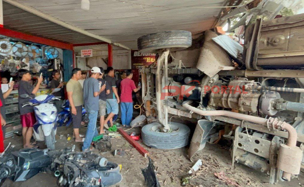 Truk kemudian menabrak bagian belakang Toyota Hilux yang berada di depannya, lalu terseret hingga masuk ke halaman bengkel. Lima sepeda motor yang terparkir ikut terseret dan tertimpa kendaraan,” jelasnya.